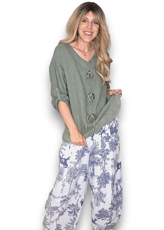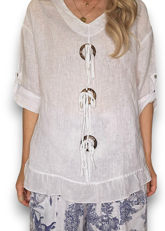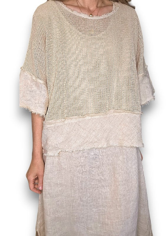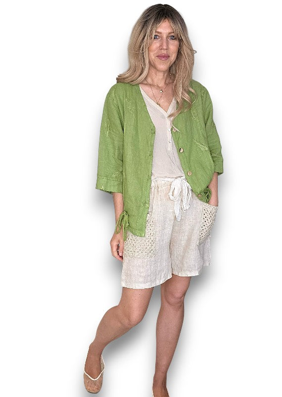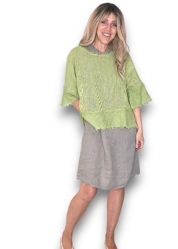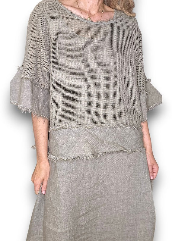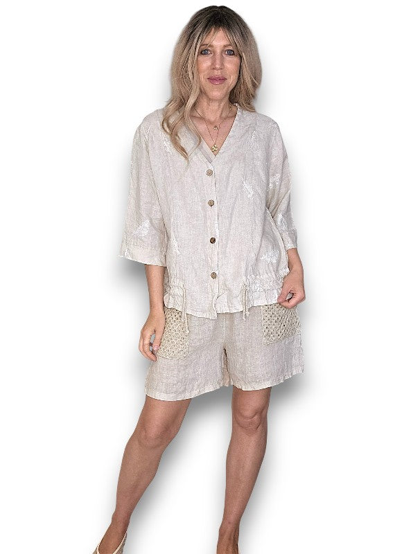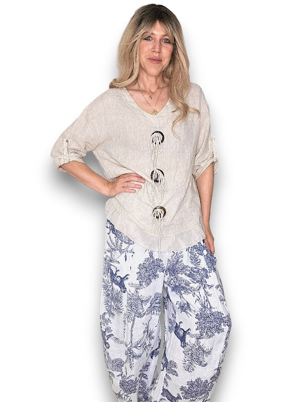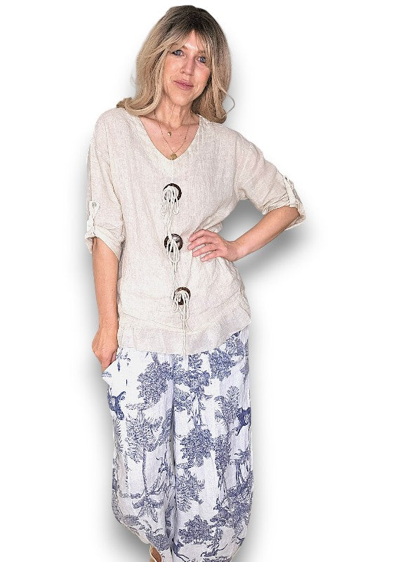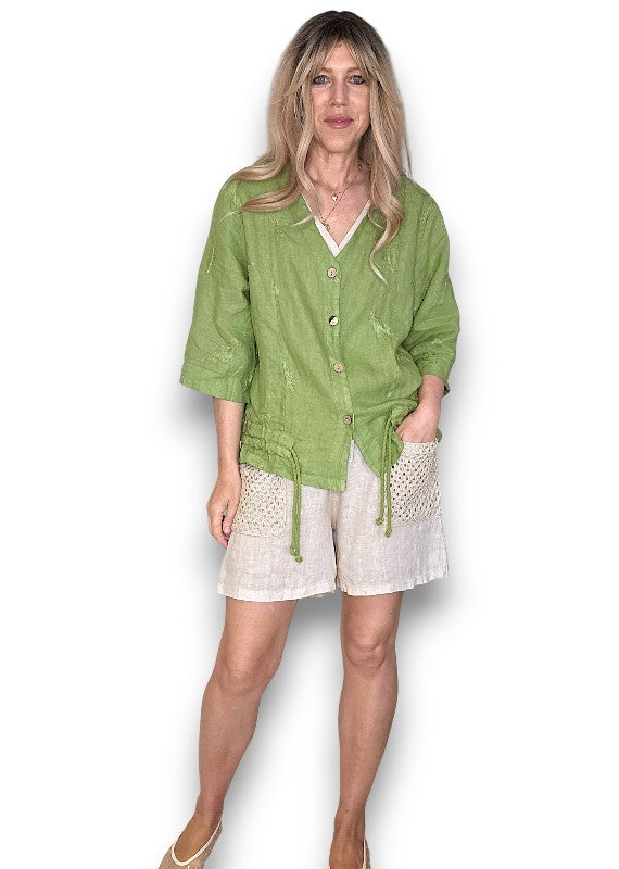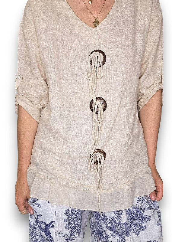 Comp:100% Linen on Main with elastic/cotton ribbing on bottom hem and sleeve ends