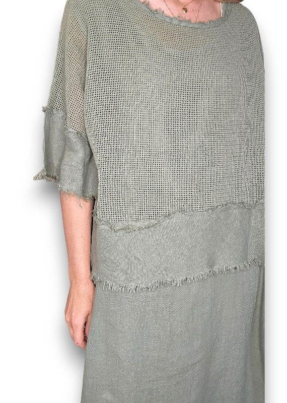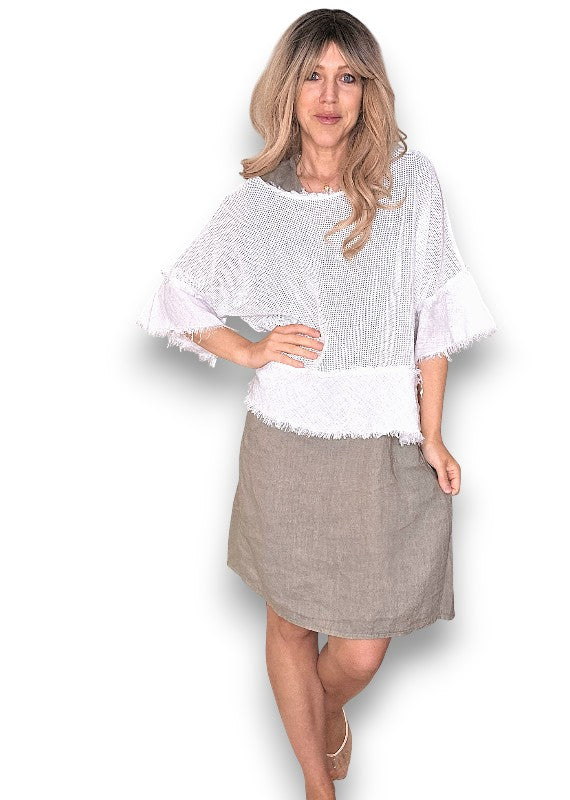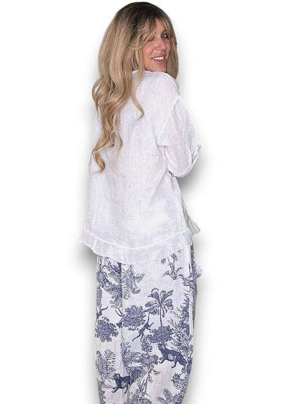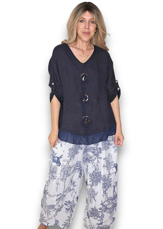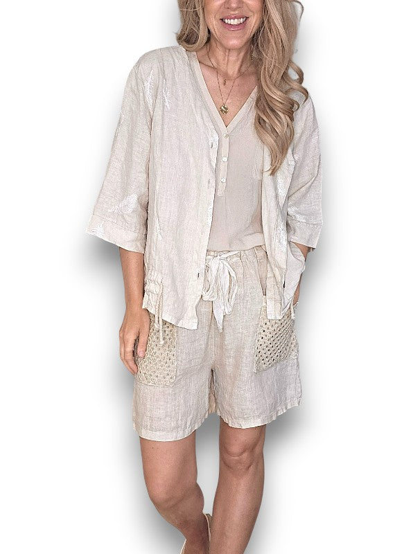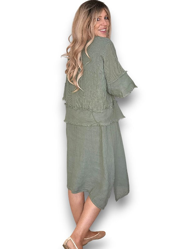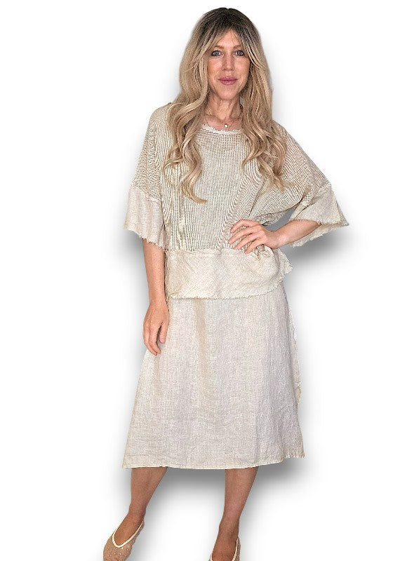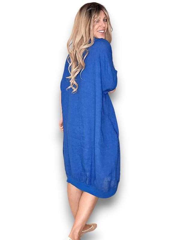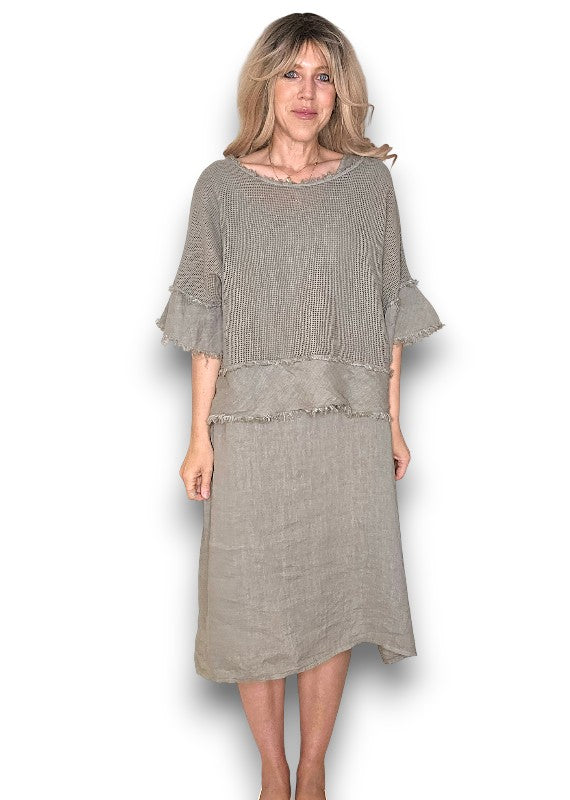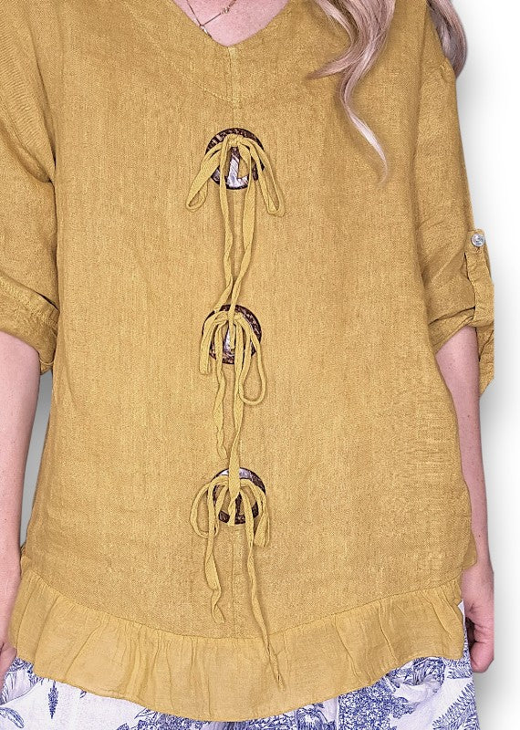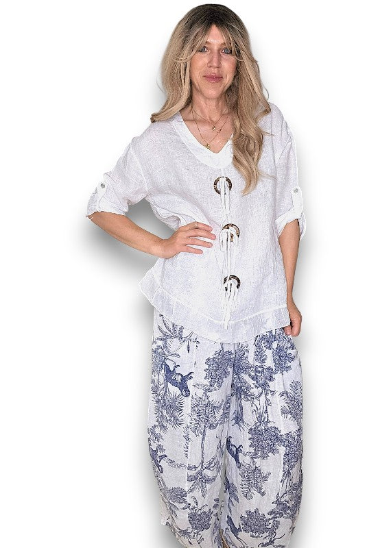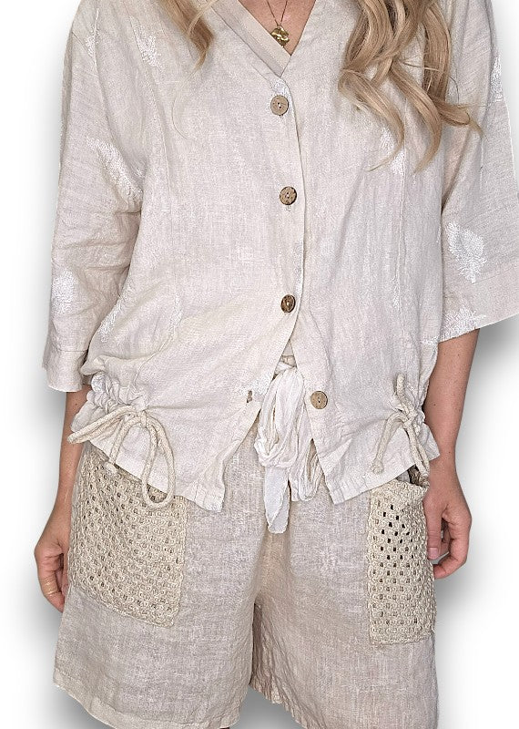 Comp:100% Linen on Main with elastic/cotton ribbing on bottom hem and sleeve ends