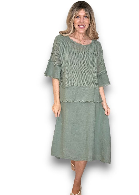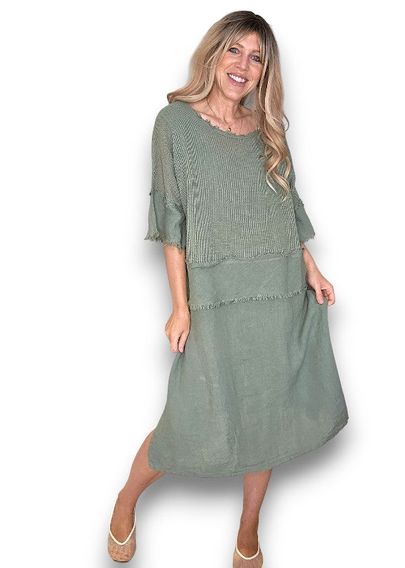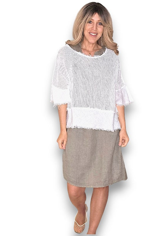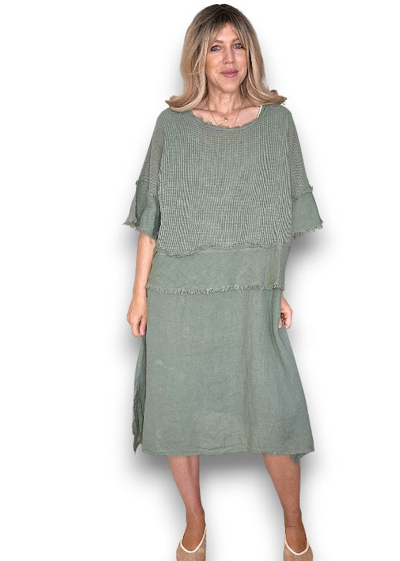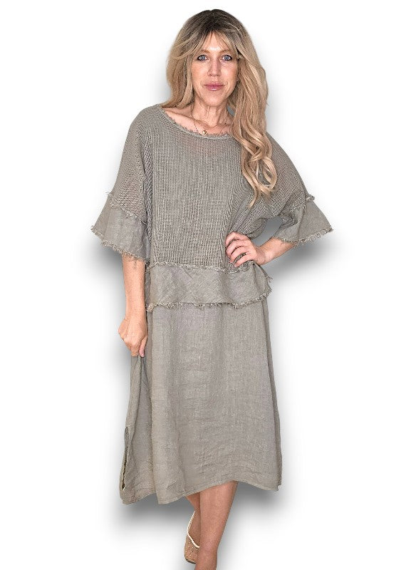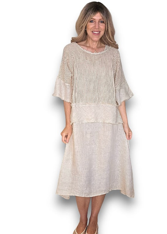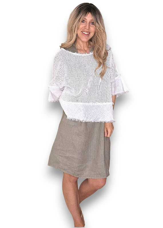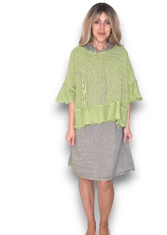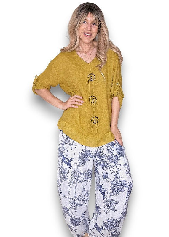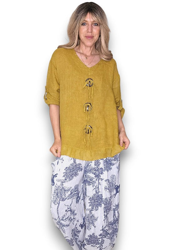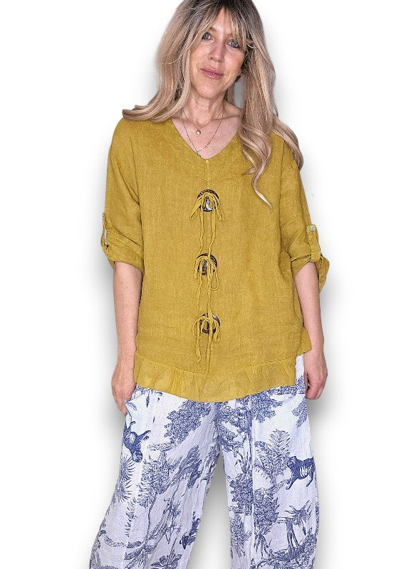 Comp:100% Linen on Main with elastic/cotton ribbing on bottom hem and sleeve ends