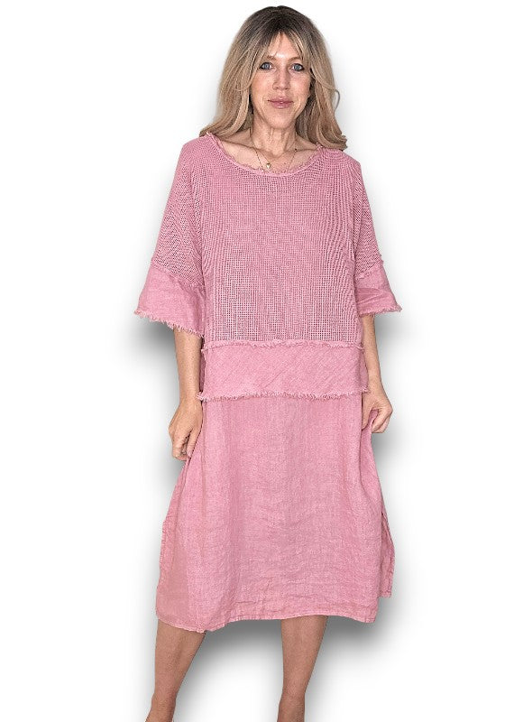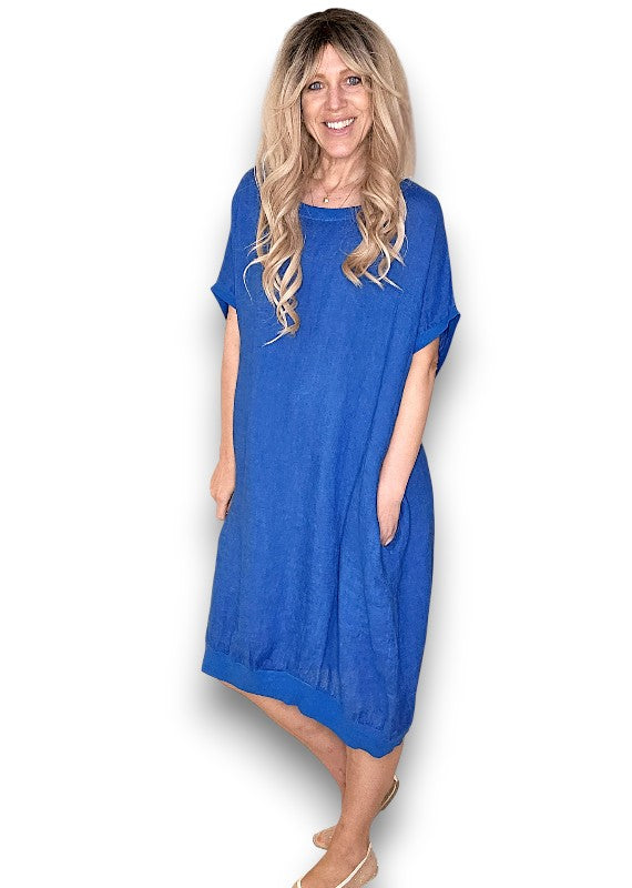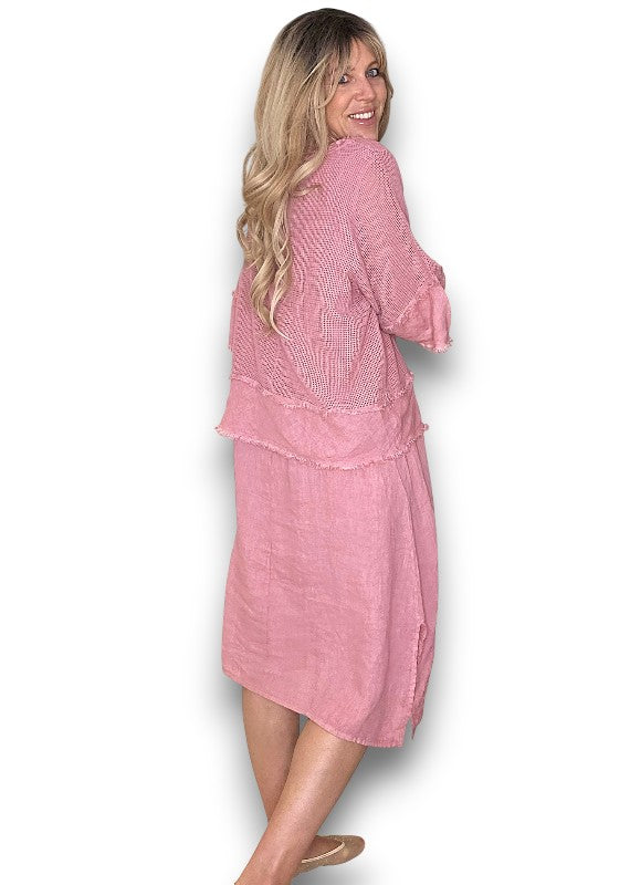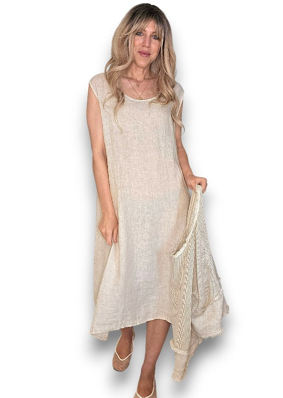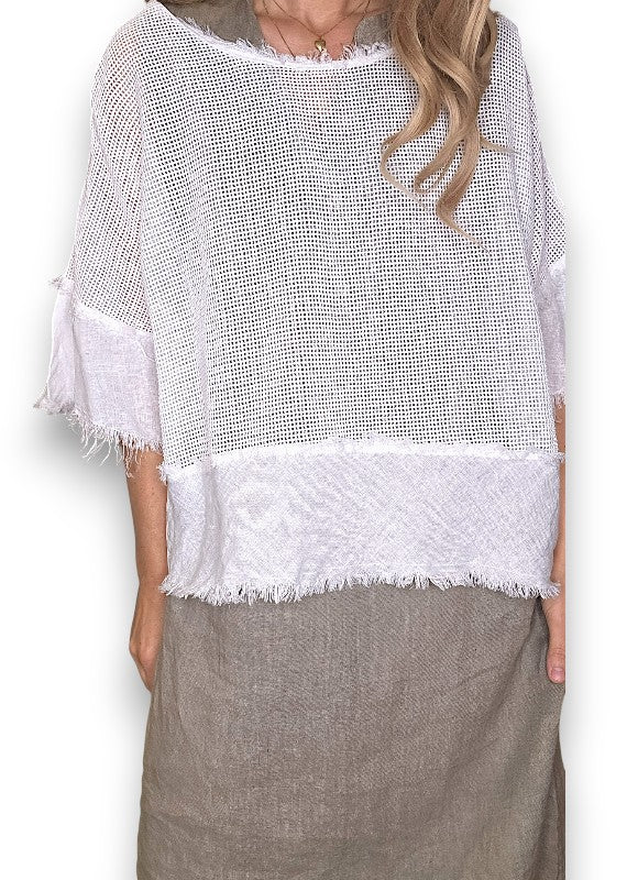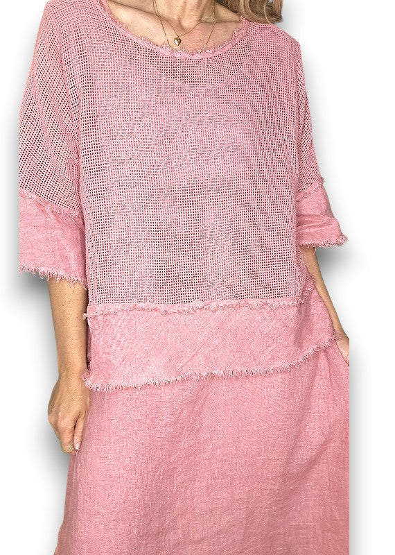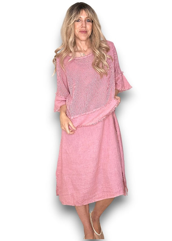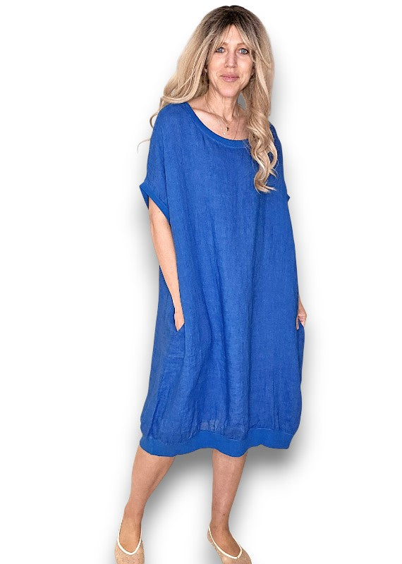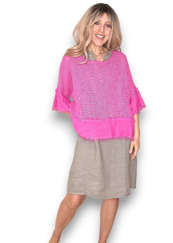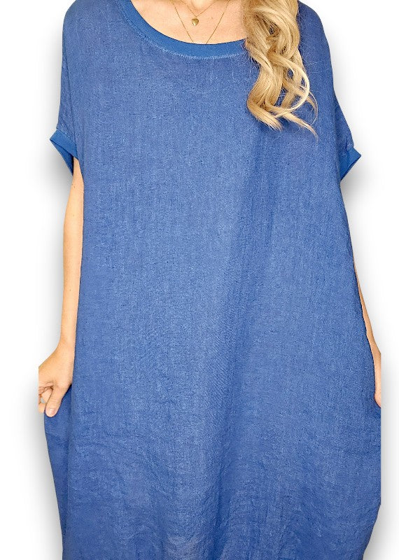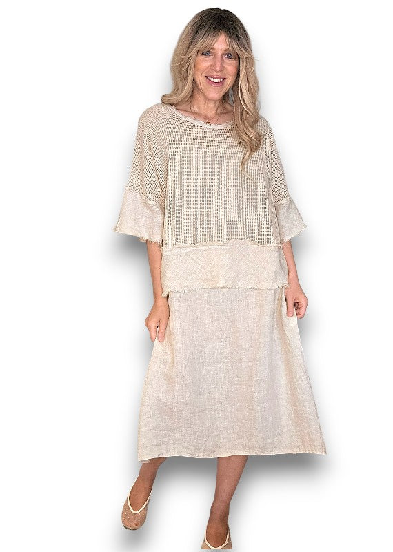 Comp:100% Linen on Main with elastic/cotton ribbing on bottom hem and sleeve ends