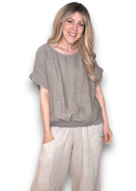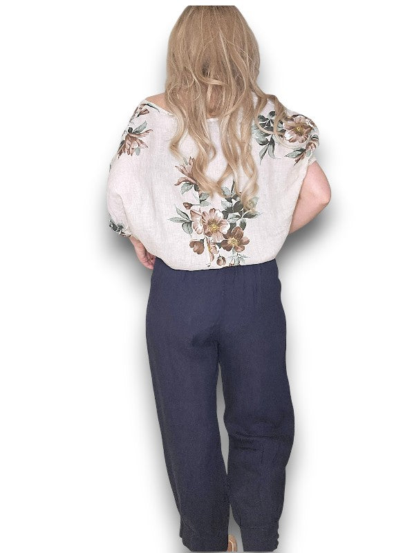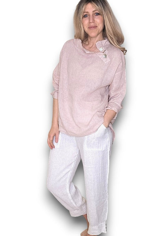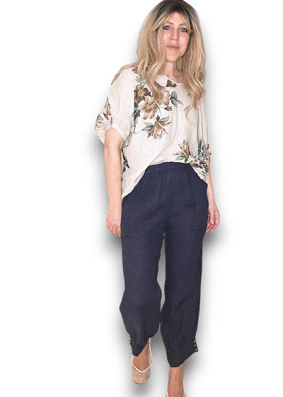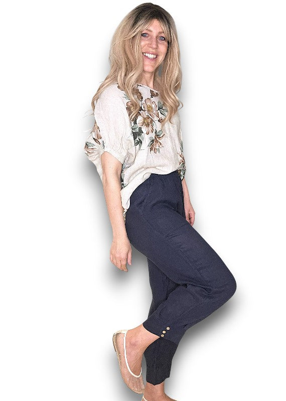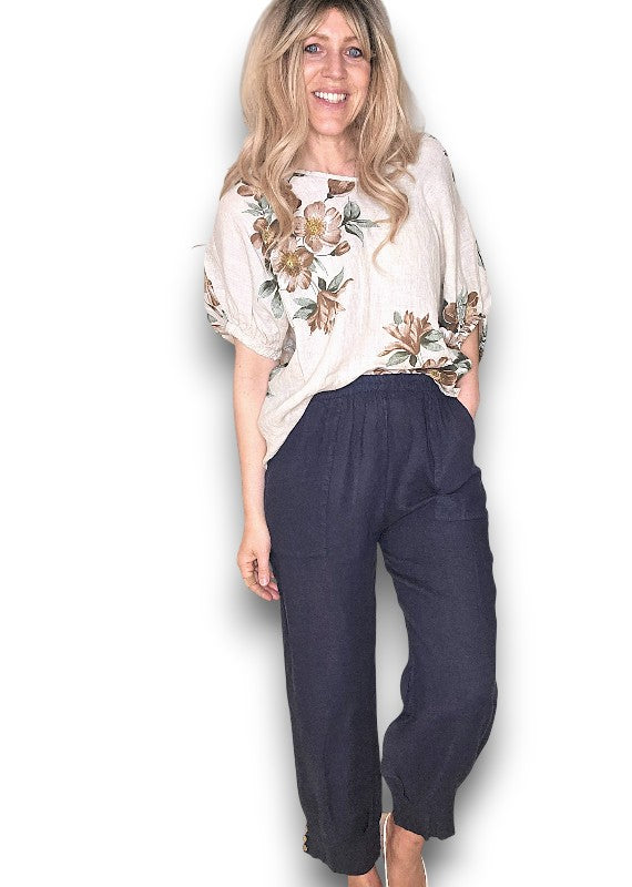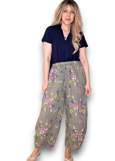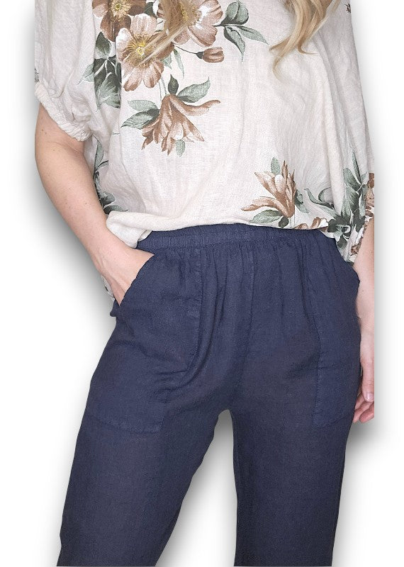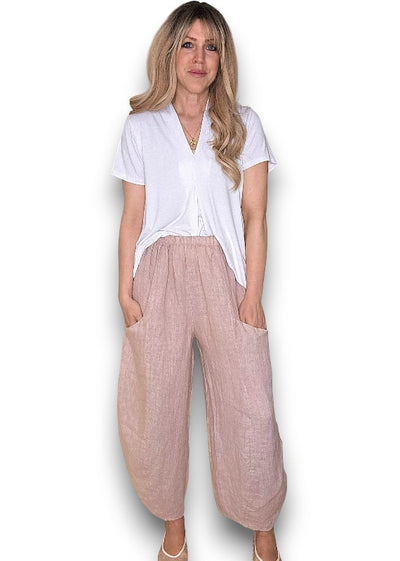 Wide and super comfortable Linen Pants with soft linen elastic waist featuring front outer pockets, Larger Free-Sizing.