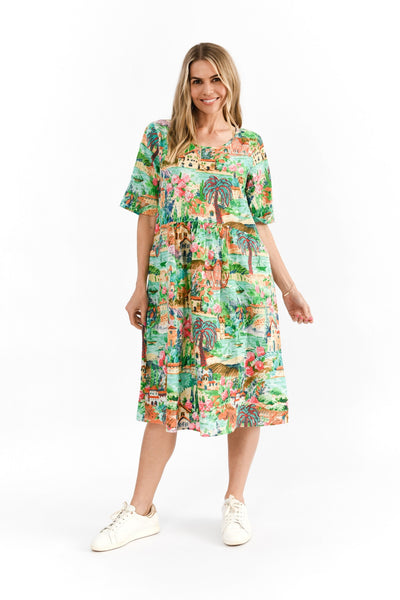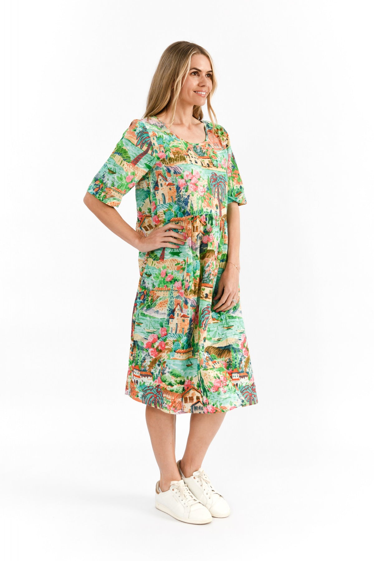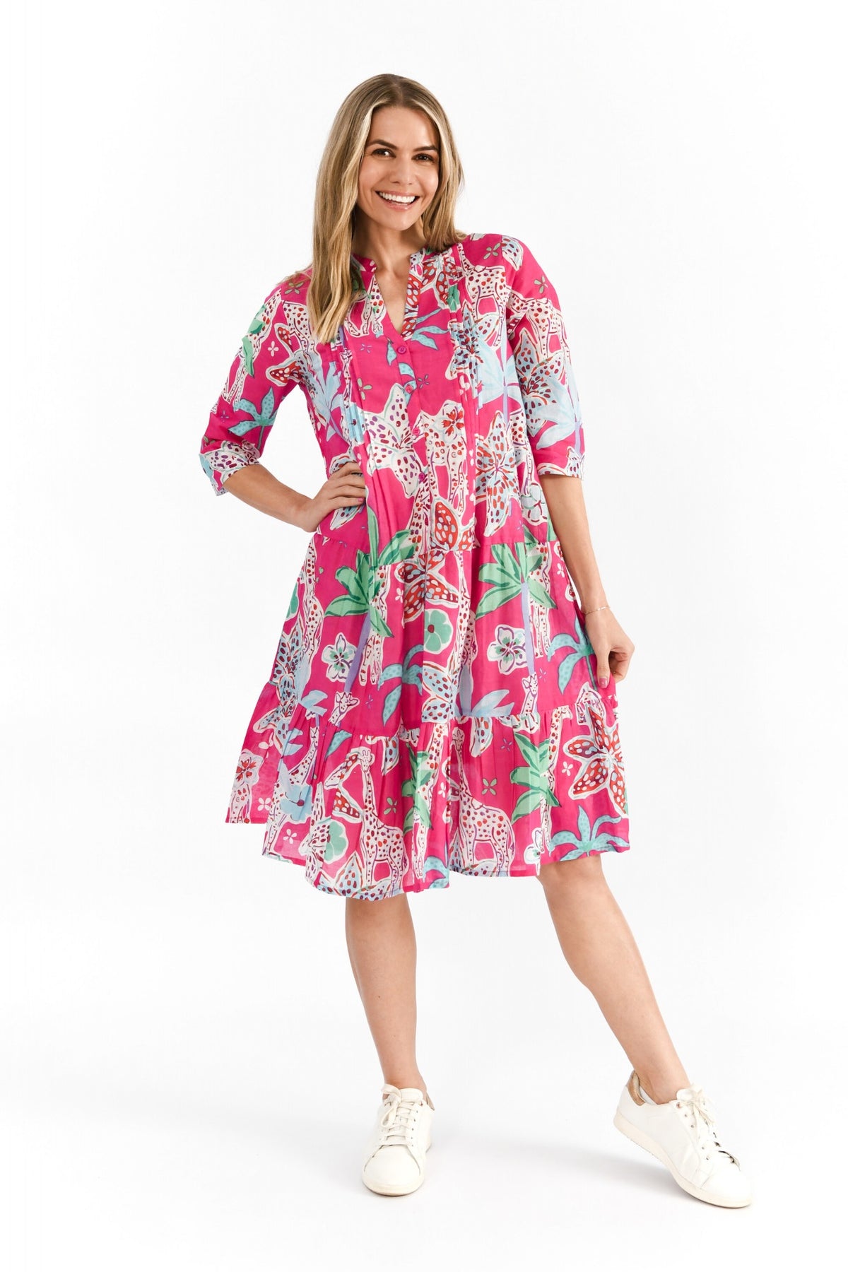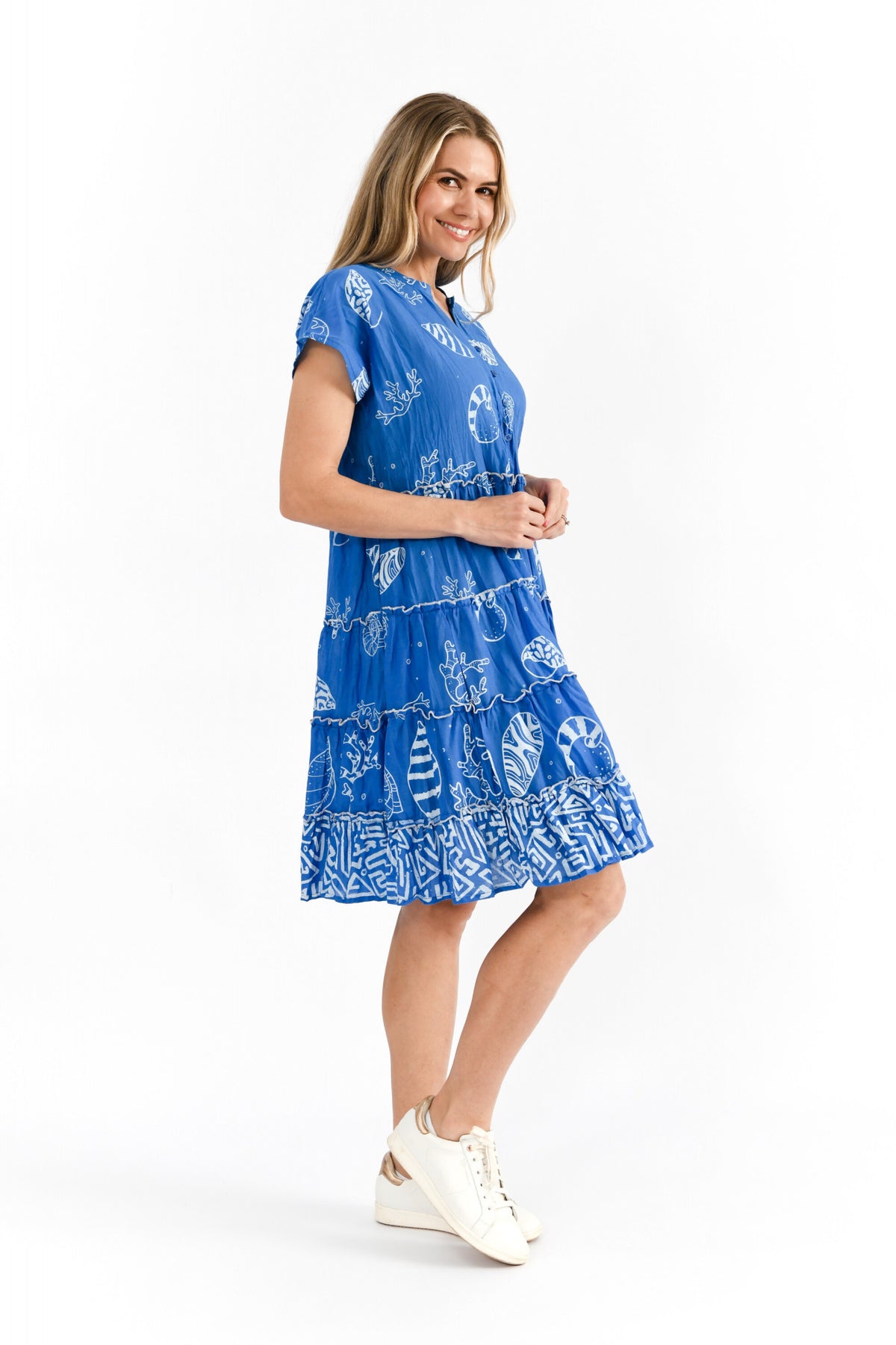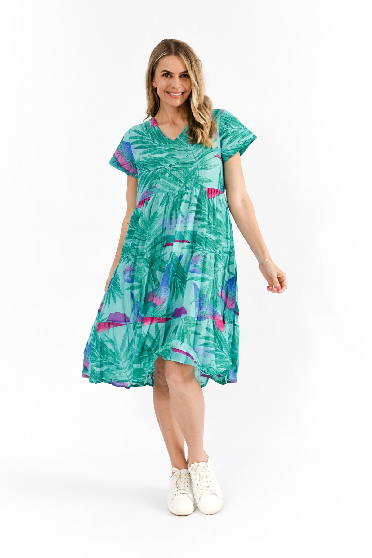 Bring effortless charm to your warm-weather wardrobe with the Leela V Neck Mini Dress. Crafted from lightweight, breathable 100% cotton, this mini dress features a playful, relaxed silhouette with a V-neckline and partial button placket for easy wear. The soft, short sleeves enhance the breezy feel, while the multi-tiered design creates volume and movement with every step. Whether you're heading to a brunch, beachside stroll, or a casual day out, this vibrant smock dress offers all-day comfort with a free-spirited, bohemian flair. Its vivid color palette and flowing shape make it the perfect throw-on-and-go piece for summer