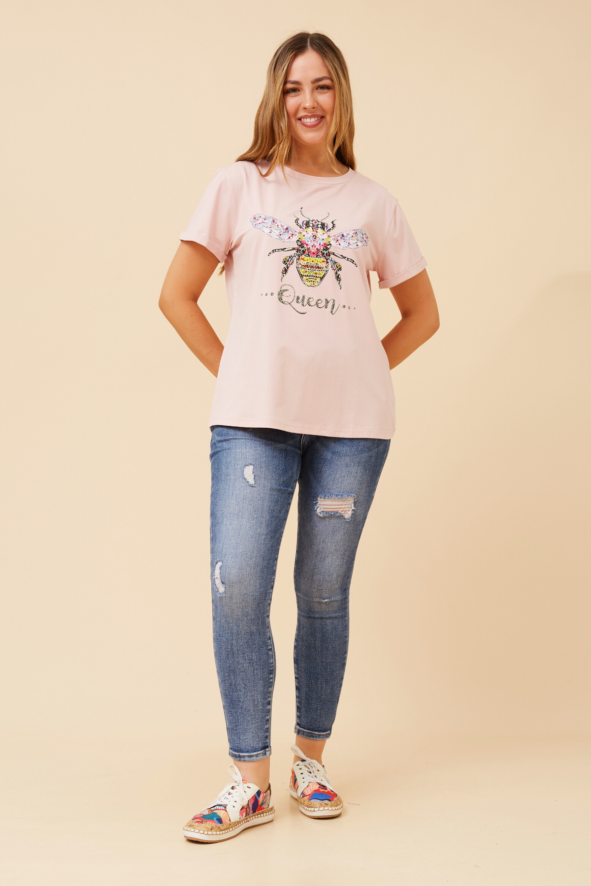 Free-Sized/Model is a size 10/12/M for reference. Best Suited on a M/L, and S for a boxy wider fit.